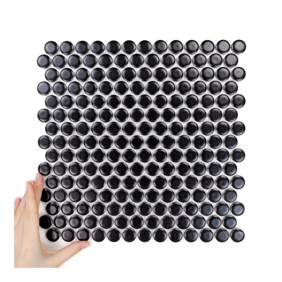 Die Kollektion Candy ist eine moderne und charmante Alternative zu klassischen Bodenmustern. Die Mosaikfliesen in Form kleiner Kreise erzeugen eine leichte, rhythmische Oberfläche, die sich sowohl für Böden als auch für Wände perfekt eignet. Inspiration für Candy Schwarz Matt war die zeitlose Einfachheit geometrischer Formen, die in runder Ausführung Frische und einen feinen Charakter erhalten. Die originelle Form und die universelle Ästhetik machen diese Kollektion ideal für minimalistische, skandinavische sowie mutige, moderne Interieurs.