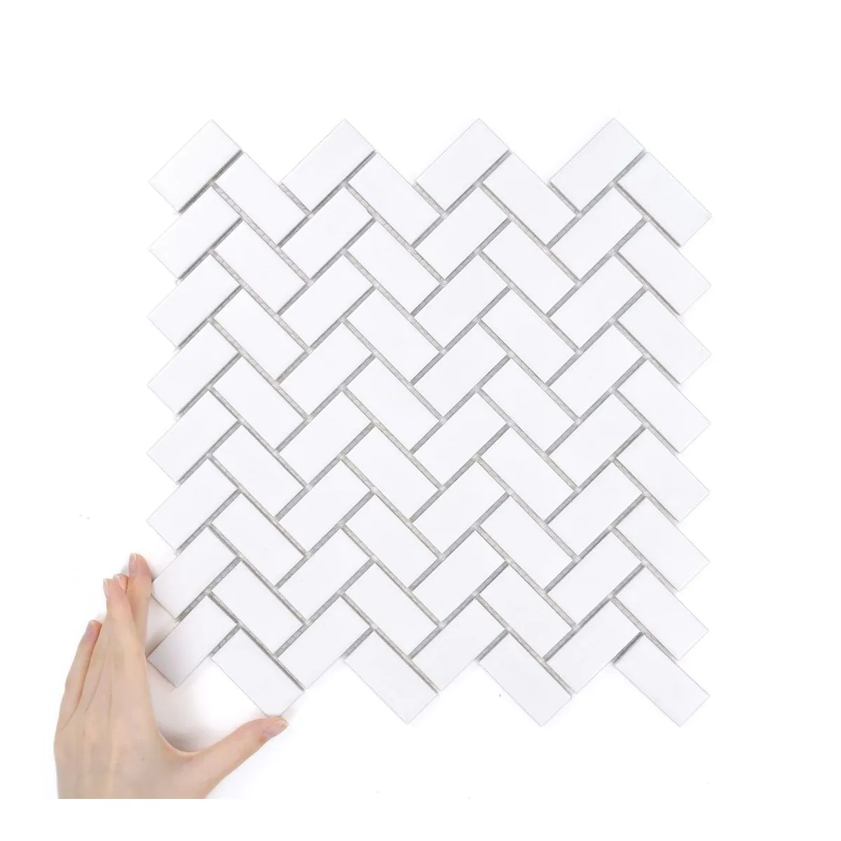 Die Inspiration für Fischgräten Weiß Matt waren traditionelle Holzparkette, die heute in Form eines zeitlosen Mosaiks eine neue Gestalt erhalten haben.