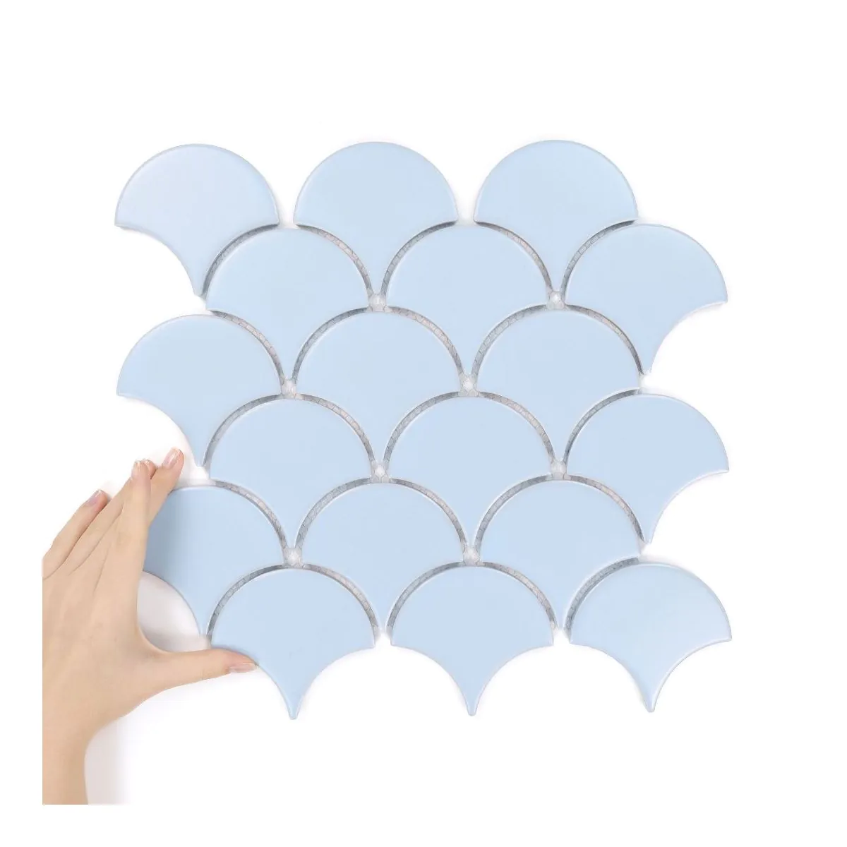 Fliesen in Fischschuppenform, die auf Matten angeordnet sind, erzeugen den Effekt einer wellenförmigen Oberfläche, die dem Raum Leichtigkeit und eine subtile Bewegung verleiht.