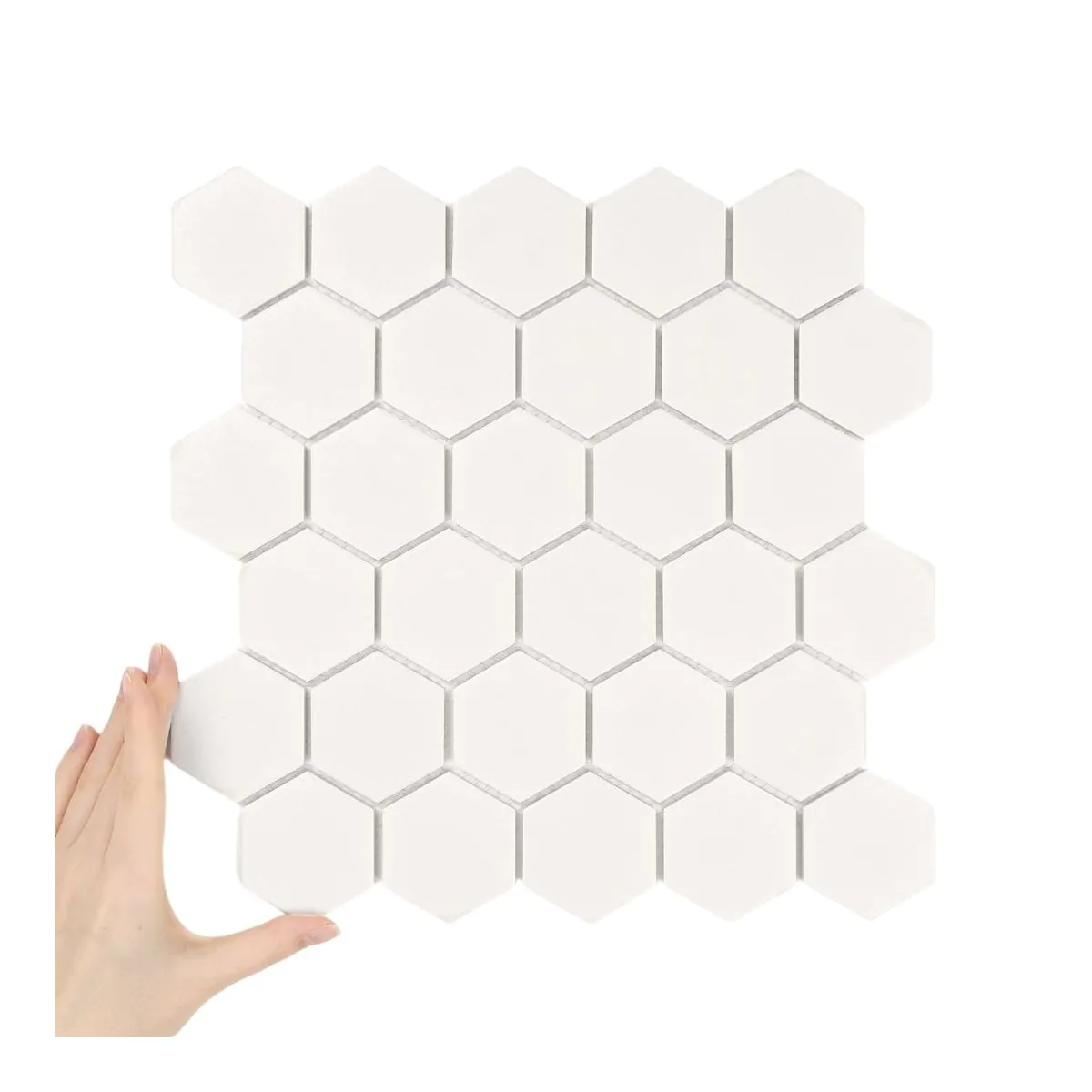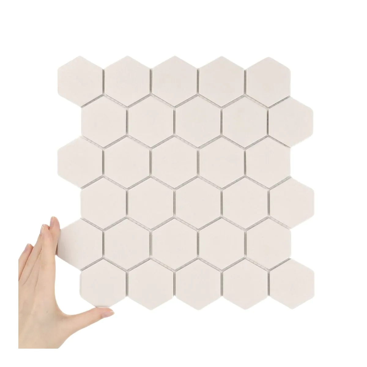 Regelmäßige sechseckige Fliesen, die auf Matten angeordnet sind, schaffen ein stimmiges und harmonisches Gesamtbild und bieten gleichzeitig vielfältige Gestaltungsmöglichkeiten.