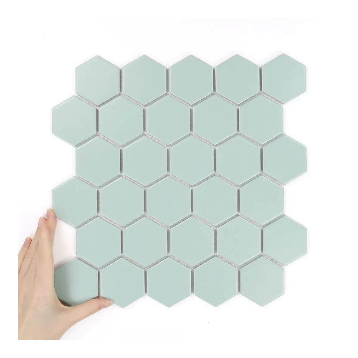 Regelmäßige sechseckige Fliesen, die auf Matten angeordnet sind, schaffen ein stimmiges und harmonisches Gesamtbild und bieten gleichzeitig vielfältige Gestaltungsmöglichkeiten.
