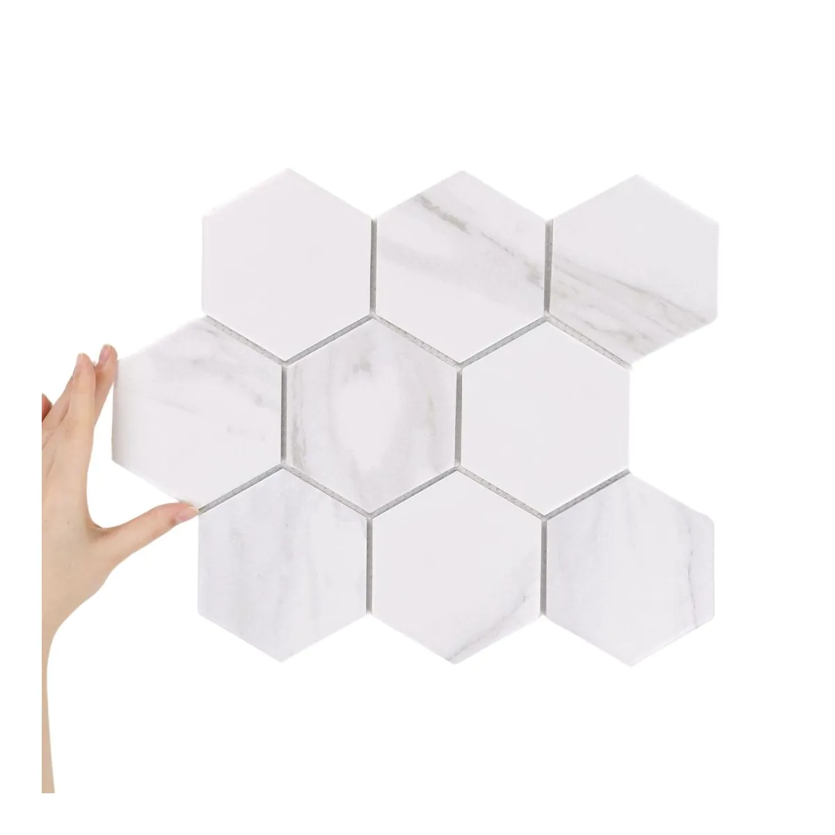 Regelmäßige sechseckige Fliesen, die auf Matten angeordnet sind, schaffen ein stimmiges und harmonisches Gesamtbild und bieten gleichzeitig vielfältige Gestaltungsmöglichkeiten.