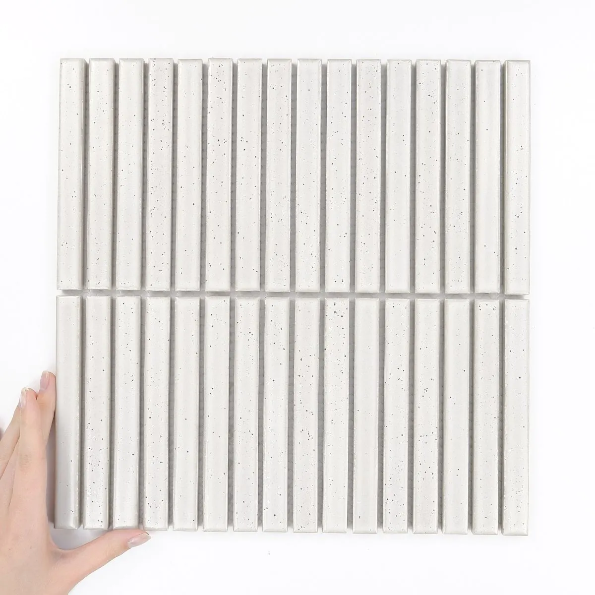 Schmale, längliche Fliesen fügen sich zu rhythmischen Kompositionen zusammen, die dem Raum besondere Leichtigkeit verleihen.